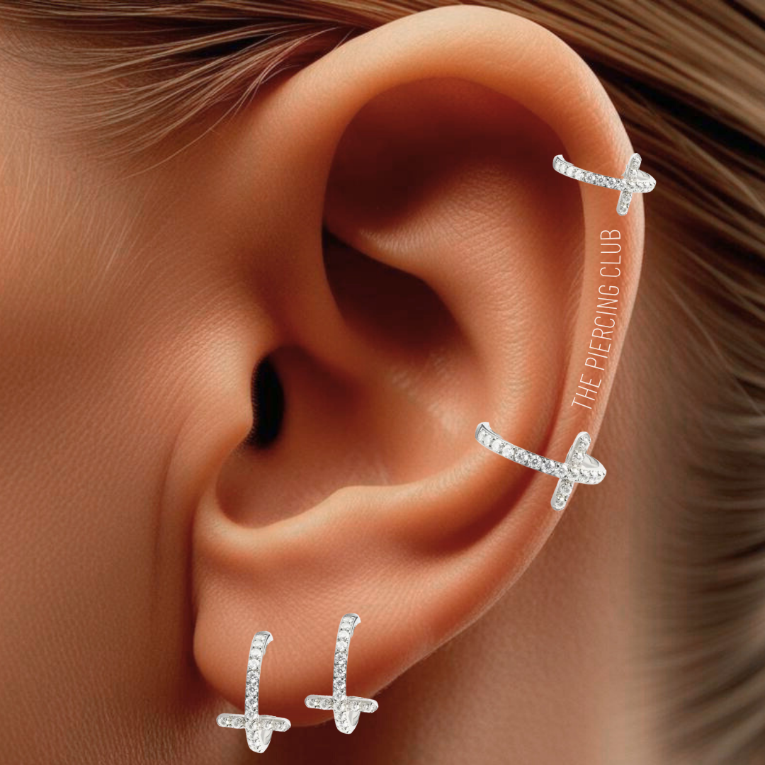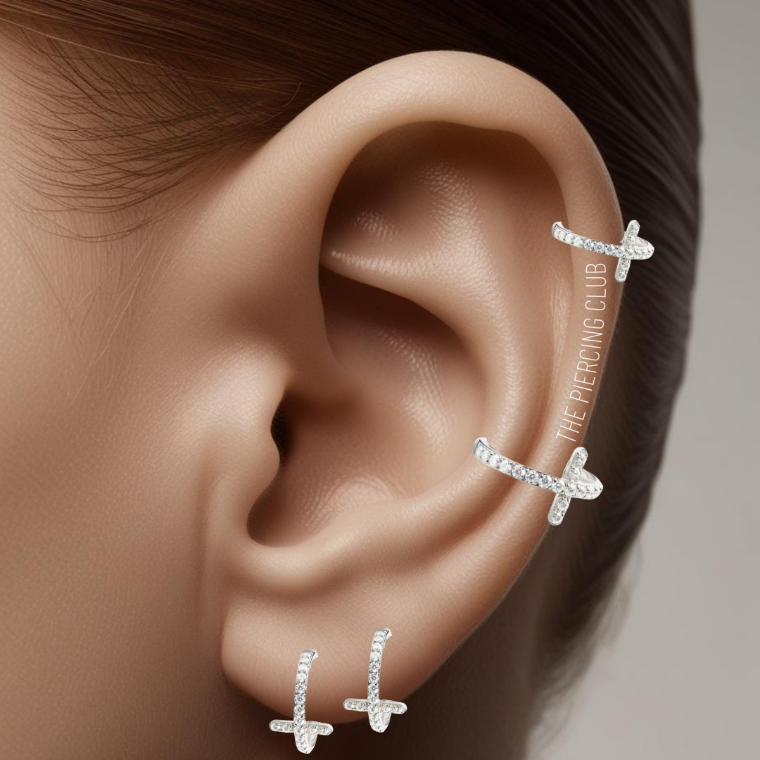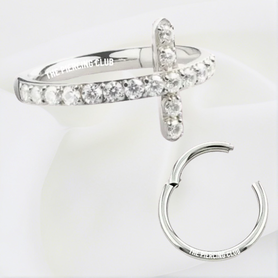 Aro, argolla cruz cristal blanco deluxe / Helix, Conch, Lóbulo, titanio grado implante