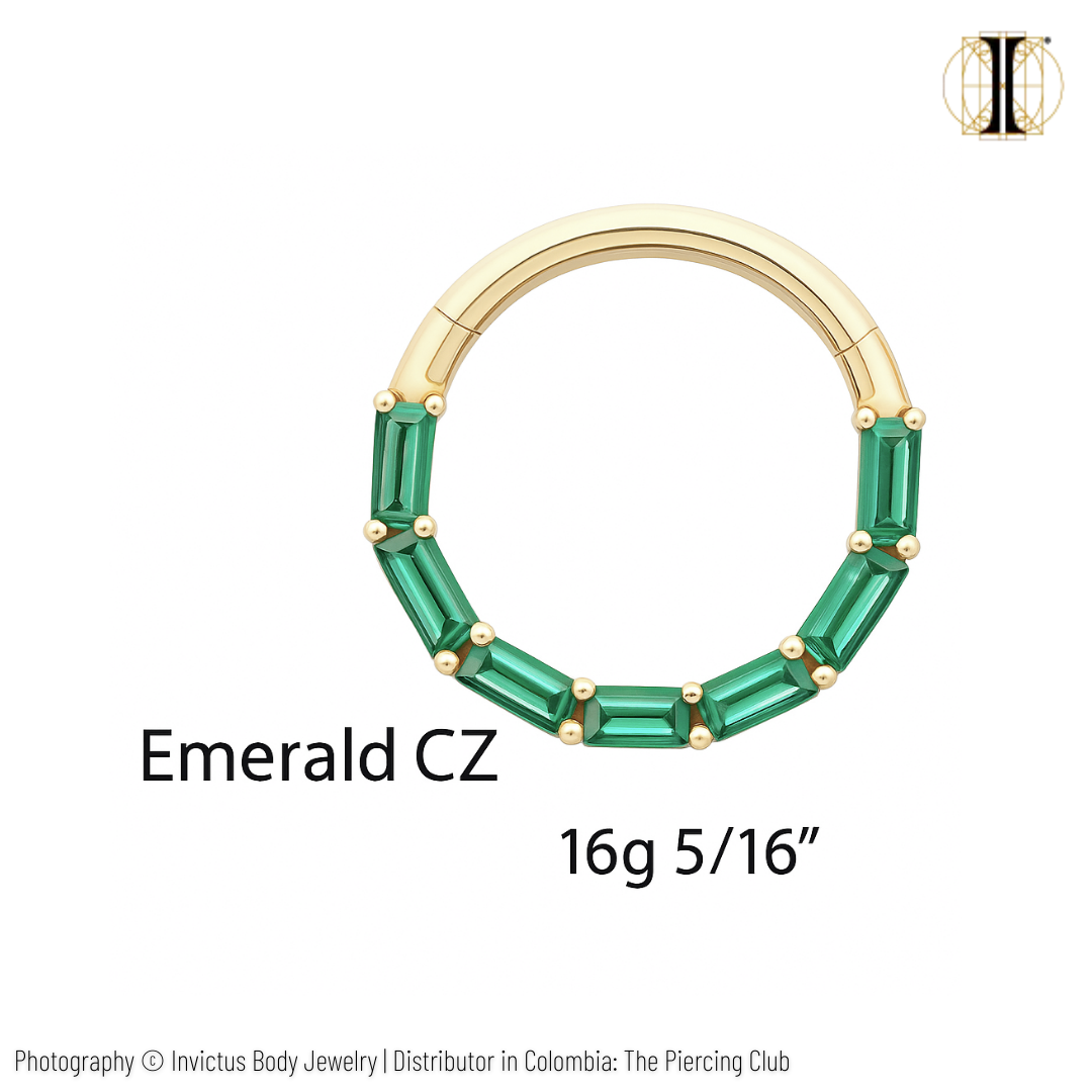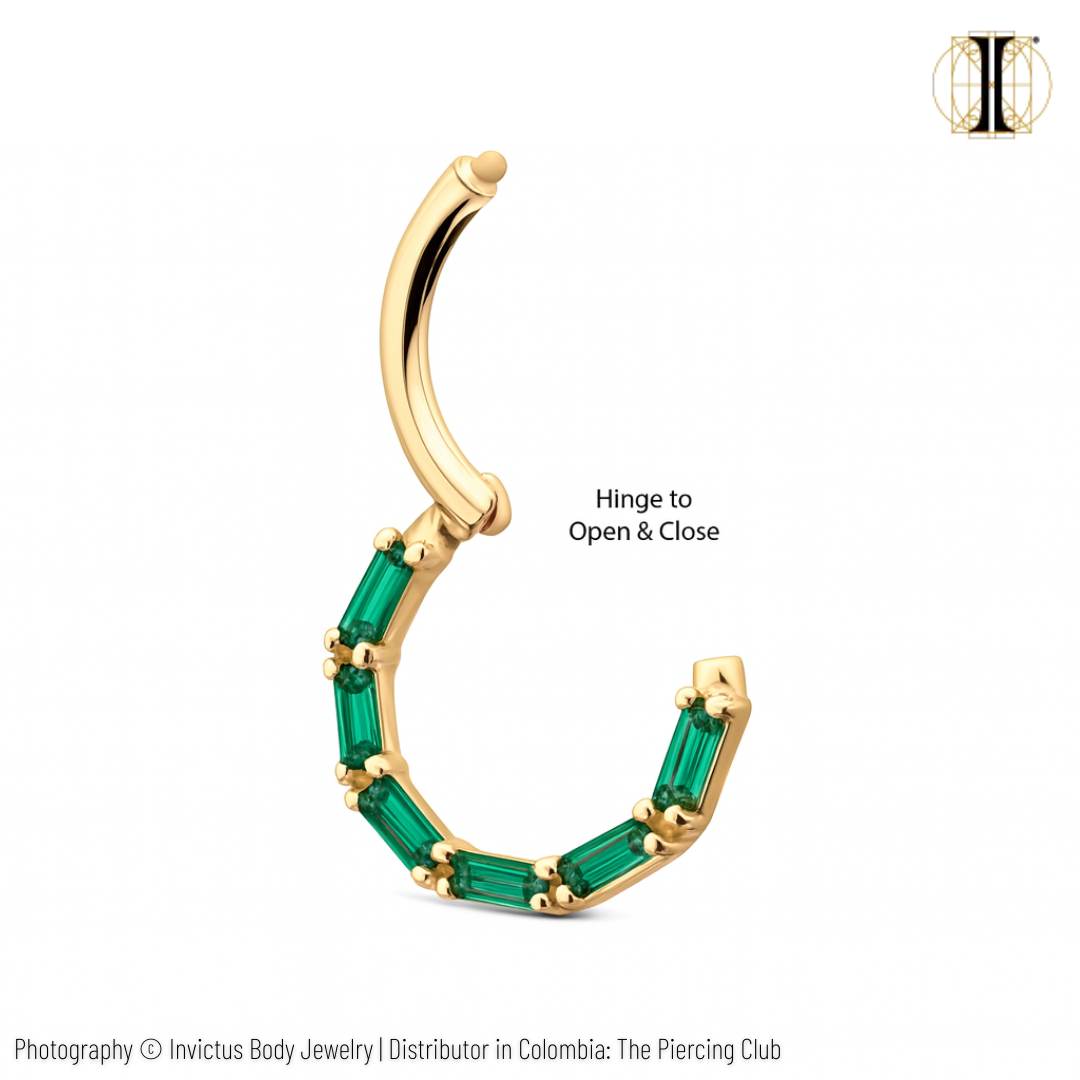 Aro, argolla frontal baguette con cristales verdes suizos / Oro sólido 14k / INVICTUS
