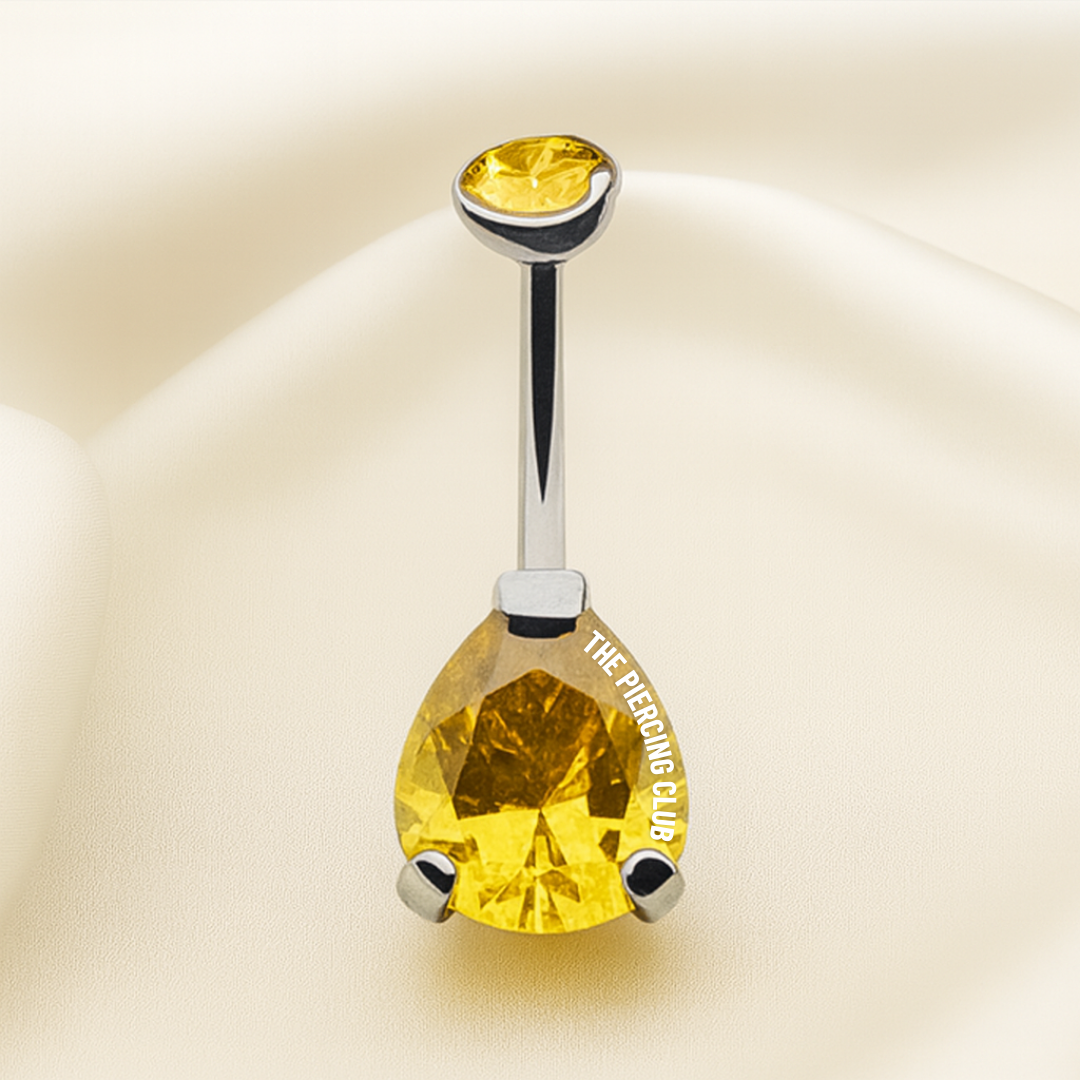, con cristales suizos amarillos. Su corte en forma de gota hace que tu ombligo se vea mas alargado y tu abdomen mas esbelto. Si lo tuyo es destacar, esta pieza es para ti.