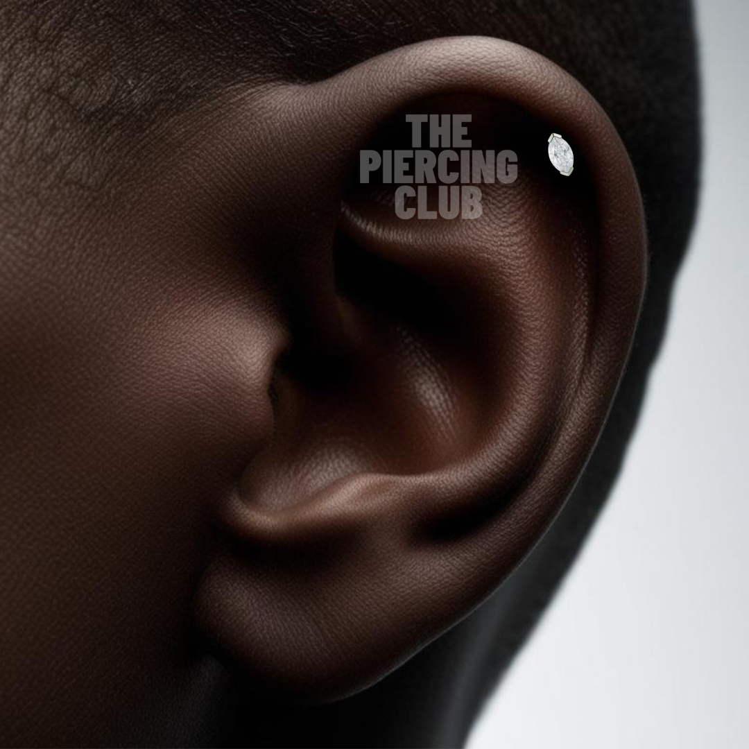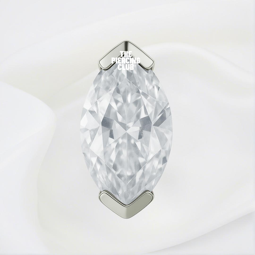 Esta joya de un solo cristal suizo marquesa en tono blanco captura la magia de cada ángulo. En titanio grado implante, se adapta con elegancia a perforaciones como Helix. Su forma alargada estiliza la anatomía, proyectando un brillo suave que parece moverse con tu energía. Perfecta para quienes creen que una sola pieza puede decirlo todo, sin decir demasiado.