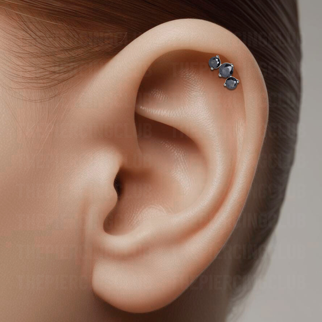 Esta joya de tres cristales suizos negros en titanio grado implante equilibra delicadeza y estilo. Su forma se adapta con naturalidad a la anatomía del cartílago, creando una línea suave que destaca sin esfuerzo. Ideal si buscas una pieza que resalte, sin dejar de sentirse cómoda y segura.