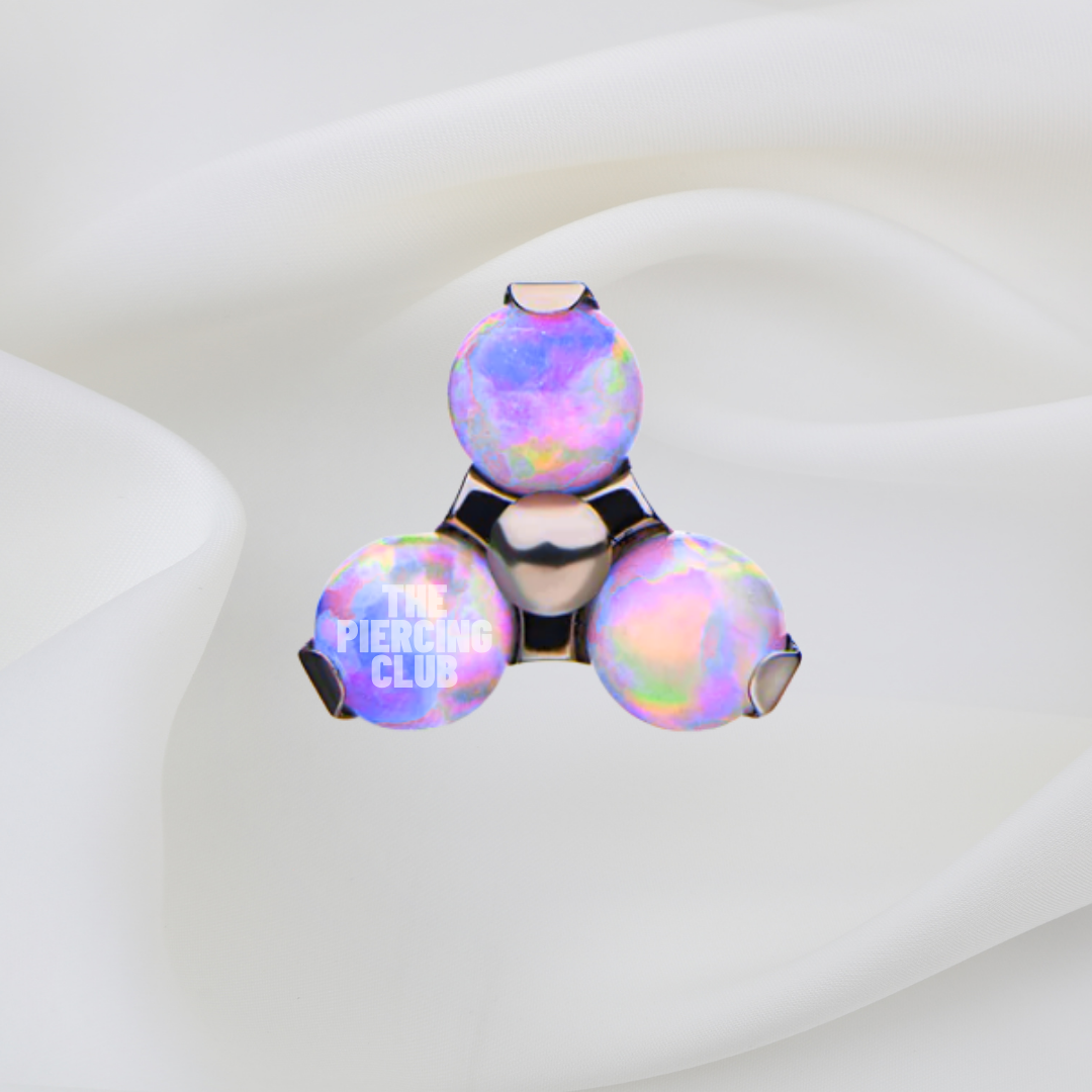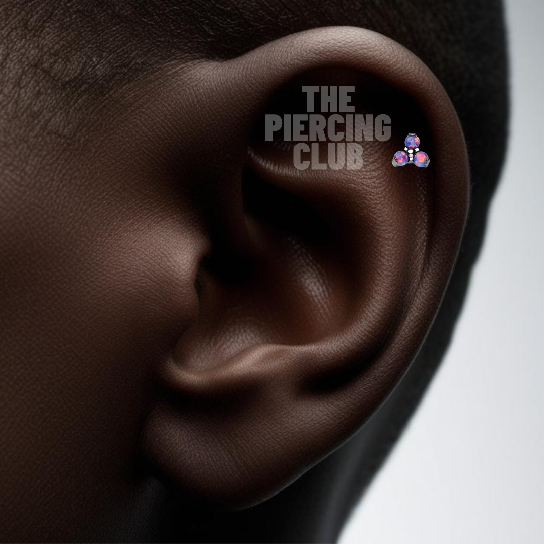 Esta joya de titanio grado implante con tres ópalos amatistas forma una figura triangular que sigue con armonía la curvatura natural del Helix. El juego de luz del ópalo refleja matices marinos que evocan calma, profundidad y movimiento. Ideal para quienes buscan una pieza con personalidad, sin perder delicadeza.