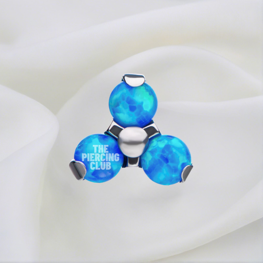 Esta joya de titanio grado implante con tres ópalos azules forma una figura triangular que sigue con armonía la curvatura natural del Helix. El juego de luz del ópalo refleja matices marinos que evocan calma, profundidad y movimiento. Ideal para quienes buscan una pieza con personalidad, sin perder delicadeza.